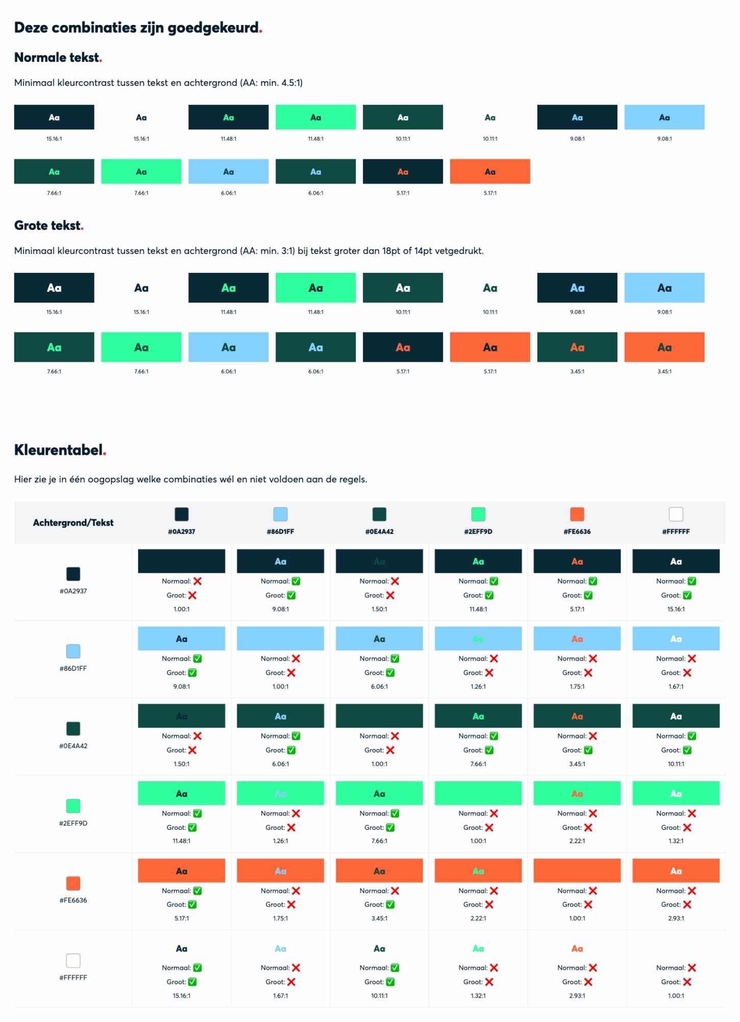 Volgens de richtlijnen moet content op de website voldoen aan de WCAG 2.1 AA-norm, wat minimale kleurcontrasten inhoudt. In onderstaande download vind je alle kleurencombinaties met daarbij de richtlijnen voor het contrast.